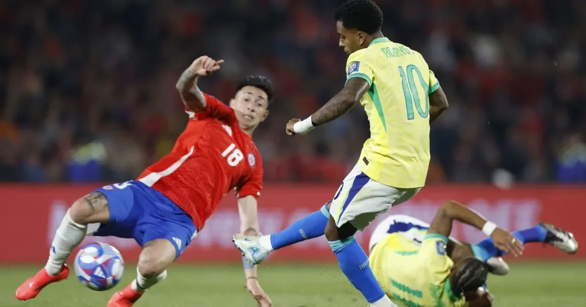 O Brasil venceu o Chile por 3 a 0 nesta quinta-feira (4), em jogo válido pela 17ª rodada das Eliminatórias Sul-Americanas da Copa do Mundo. A seleção, já classificada, chegou aos 28 pontos e ocupa a segunda colocação. O time comandado por Carlo Ancelotti impôs seu ritmo desde o início, com um quarteto ofensivo formado por Martinelli, João Pedro, Estêvão e Raphinha.